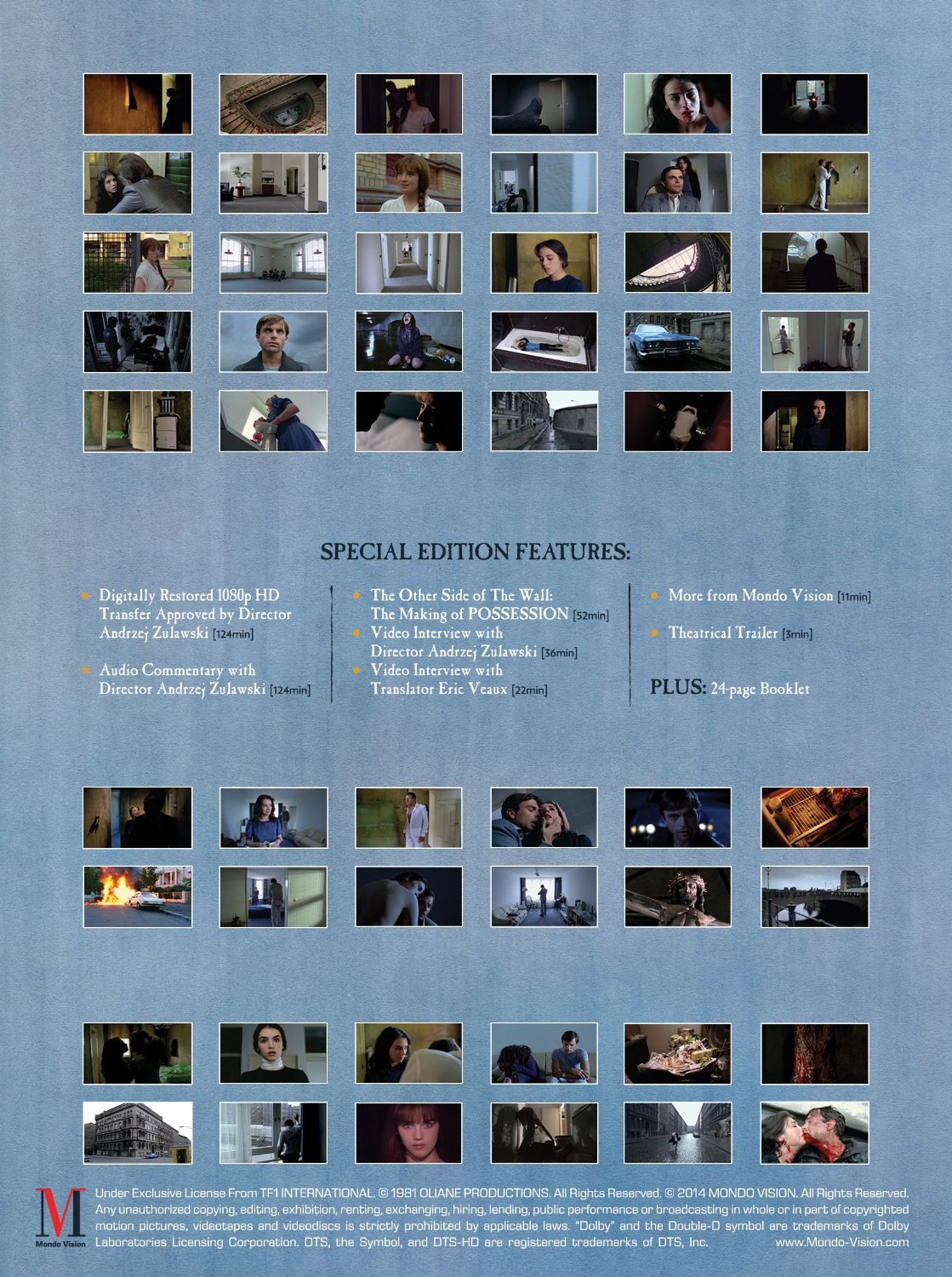 - The Other Side of the Wall - a making of featurette with information about the production history of Possession, the film's visual style and narrative structure, the relationships between the main characters, the film's reception at the Cannes Film Festival, Andrzej Zulawski's career, etc. Included are clips from interviews with the Polish director, co-producer Frederic Tuten, producer Marie-Laure Reyre, and cameraman Andrzej J. Jaroszewicz. The featurette was written and directed by Daniel Bird. In English, Polish, and French, with imposed English subtitles where necessary. (52 min).
