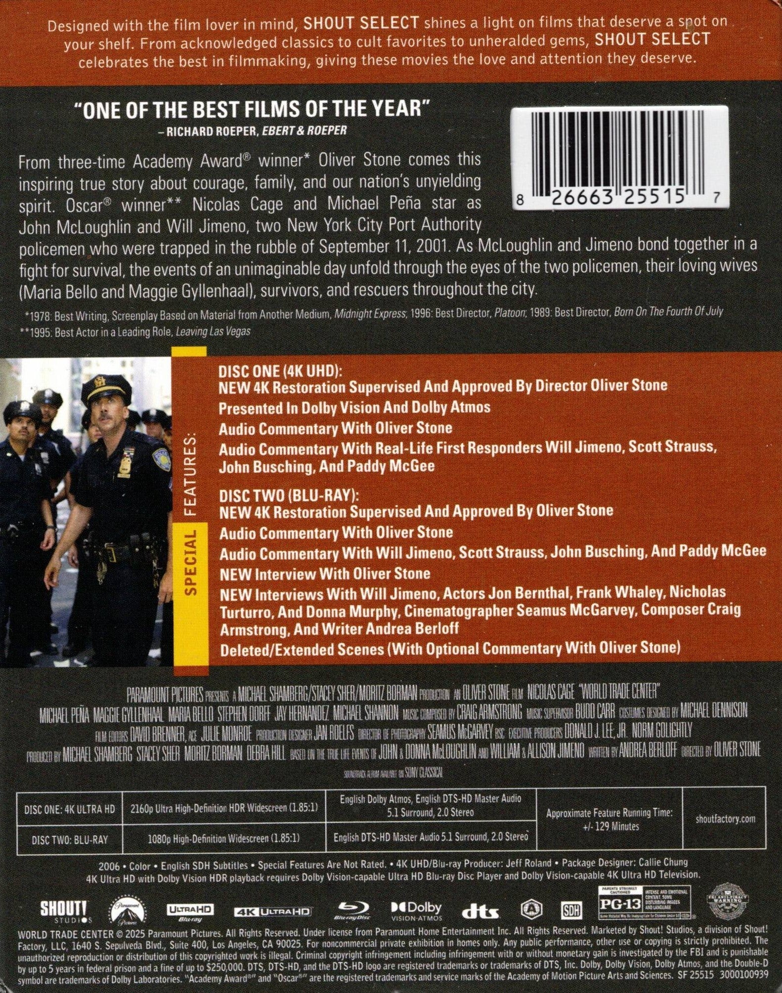 - NEW Remembering WORLD TRADE CENTER with screenwriter Andrea Berloff (22:09, 1080p) - Berloff remembers working with three producers and in particular, Debra Hill. She explains how she learned to make a movie by observing Stone and his work ethic. Berloff states that there's a binary in the film and outside of it: what the audience knows versus what the two main characters don't know. In addition, she describes the process of writing her script and life events happening to her at the time of production. She recalls a table read with Nicolas Cage and her impression of the actor. In English, not subtitled.